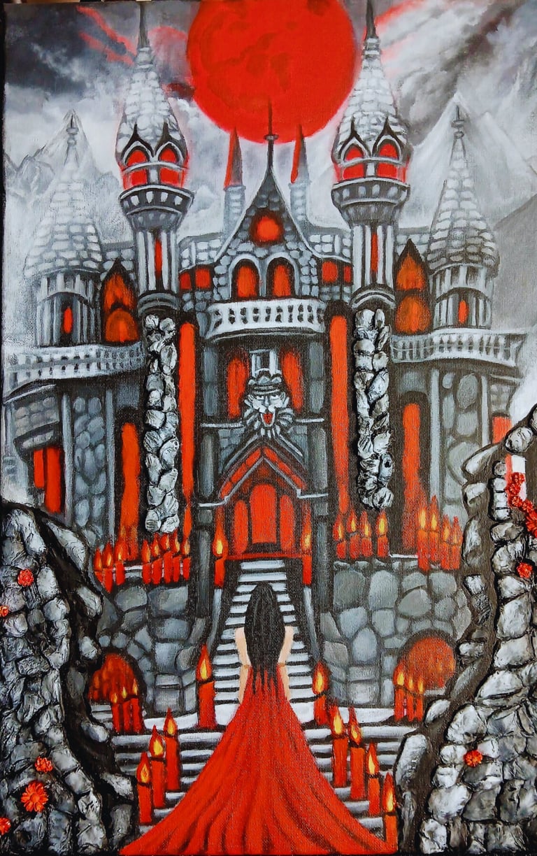 The painting is a striking and atmospheric piece that captures the essence of Stranger Things, blending the iconic characters of Vecna and Eleven in a dramatic confrontation.